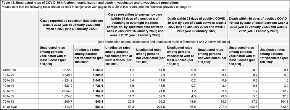 Dans ce tableau de l’UKHSA (Agence de Sécurité de la Santé britannique), vous pouvez voir que chaque groupe d’âge d’adultes non vaccinés présente des taux de cas plus élevés que les adultes vaccinés du même âge, et ce par rapport aux personnes ayant reçu trois doses, et pas seulement deux.