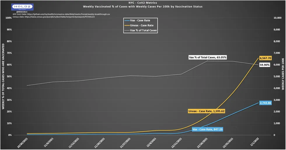 Dans ce graphique de NYC, j’ai marqué les semaines du 18 décembre et du 1er janvier afin de montrer que le 18 décembre a achevé une plus grande partie du processus de CDV et est donc plus proche avec un pourcentage plus élevé de cas de personnes vaccinées (63,05). Le 25 décembre et le 1er janvier sont proches mais n’ont pas encore rattrapé leur retard. Je m’attends à ce que la ligne blanche dépasse le 18 décembre dès la mise à jour du 17 février. Lorsque cela se produira, la ligne des non-vaccinés (jaune) se rapprochera de la ligne des vaccinés (bleu).