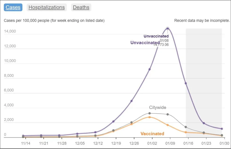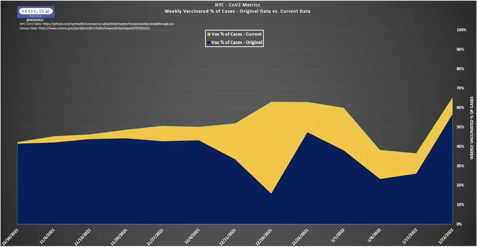 Mais lorsque vous regardez mon graphique ci-dessous, vous pouvez clairement voir comment le schéma intégrant les CDV est incomplet pour les semaines du 8 janvier et du 15 janvier, où il y a actuellement un creux artificiel qui correspond à la montagne inverse sur le graphique de NYC. Comme vous pouvez probablement le deviner maintenant, le creux artificiel dans mon graphique va se combler, et le pic artificiel sur le graphique de NYC va diminuer, ainsi qu’une augmentation correspondante sur la ligne orange vaccinée.