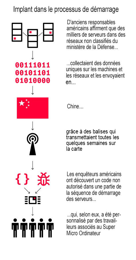 Les machines se sont avérées être chargées d’instructions non autorisées enjoignant à chacun de copier secrètement des données sur lui-même et son réseau et d’envoyer ces informations à la Chine, selon six anciens hauts fonctionnaires qui ont décrit une enquête confidentielle de l’incident. Le Pentagone a découvert l’implant dans des milliers de serveurs, selon un fonctionnaire ; un autre l’a décrit comme « omniprésent ».