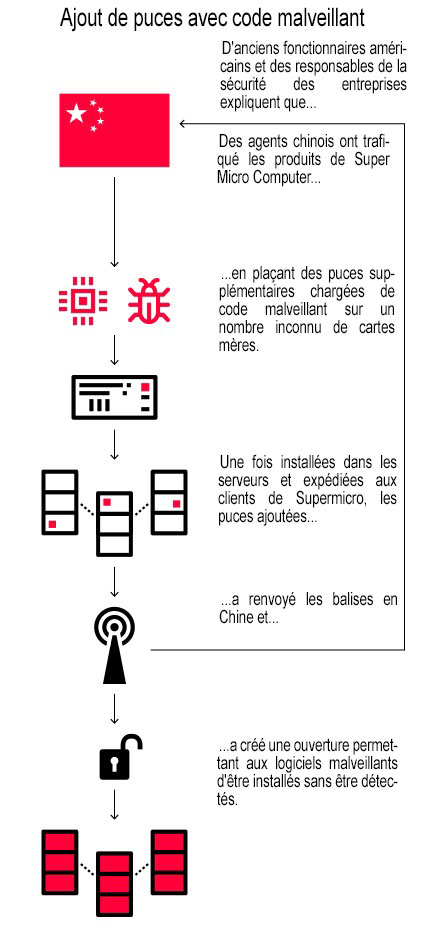 Et en 2015, le Federal Bureau of Investigation a averti plusieurs entreprises que des agents chinois avaient dissimulé une puce supplémentaire chargée d’un code de porte dérobée dans les serveurs d’un fabricant.