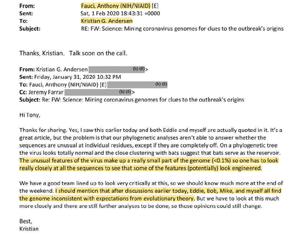 Le 1er février 2020, Fauci a été informé par le scientifique Kristian Andersen que les caractéristiques du virus » semblent (potentiellement) modifiées » et que le groupe d’Andersen a trouvé » le génome incompatible avec les attentes de la théorie de l’évolution. «