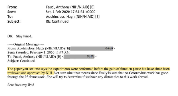 Apparemment, Fauci était inquiet. Le laboratoire de Wuhan avait mené des recherches sur le gain de fonction des virus provenant des chauves-souris. Selon un courriel de son collègue Hugh Auchincloss du NIH, un article indiquait que « les expériences ont été réalisées avant la mise en pause de la recherche sure le gain de fonction mais ont depuis été revues et approuvées par le NIH ».