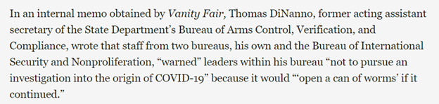 Dans un mémo interne obtenu par Vanity Pair, Thomas DiNanno, ancien secrétaire adjoint par intérim du Bureau du Contrôle des Armes, de la Vérification et de la Conformité du Département d’État, a écrit que le personnel de deux bureaux, le sien et le bureau de la Sécurité Internationale et de la Non-prolifération, « a mis en garde les dirigeants de son bureau contre la poursuite de l’enquête sur l’origine du COVID », car cela « ouvrirait la boîte de Pandore » si elle continuait.