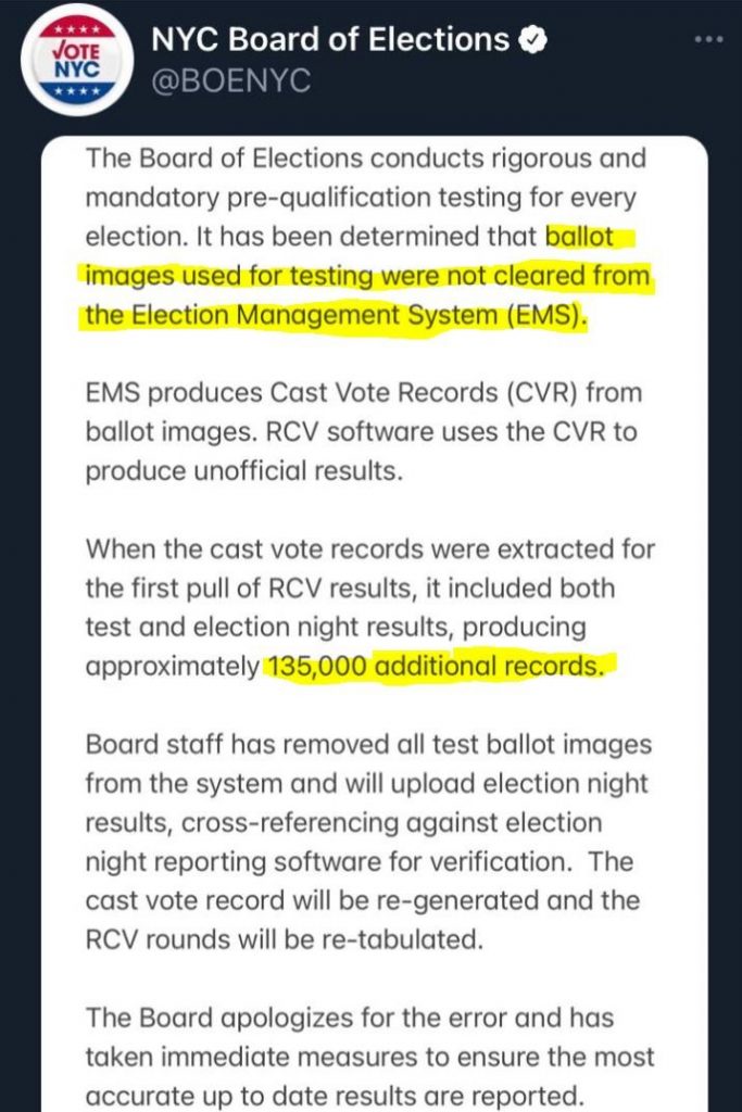 Le conseil électoral de la ville de New York a admis mardi qu’il avait laissé 135 000 bulletins de vote de test sur ses machines avant l’élection. Ces votes ont été inclus dans les résultats de la nuit de l’élection.