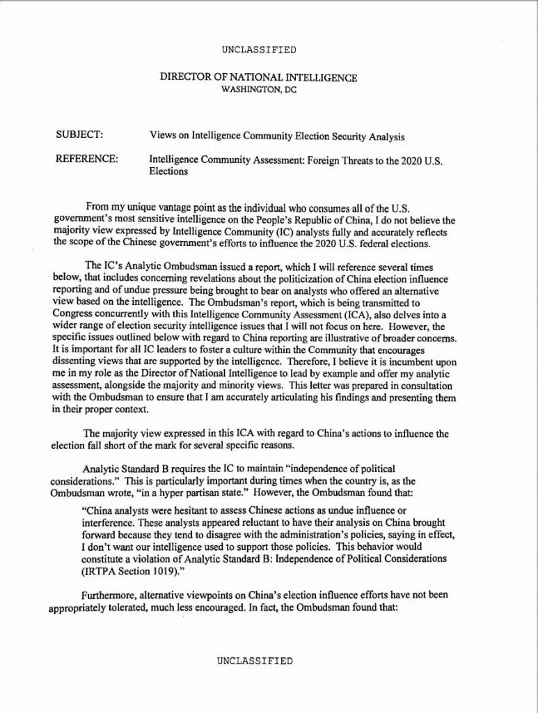 Le médiateur analytique de la CI a publié un rapport, auquel je ferai référence à plusieurs reprises ci-dessous, qui comprend des révélations sur la politisation des rapports d’influence sur les élections en Chine et sur les pressions indues exercées sur les analystes qui ont proposé un autre point de vue basé sur les renseignements. Le rapport du Médiateur, qui est transmis au Congrès en même temps que la présente évaluation de la communauté du renseignement (ICA), examine également un plus large éventail de questions relatives au renseignement de sécurité des élections sur lesquelles je ne m’attarderai pas ici. Toutefois, les questions spécifiques exposées ci-dessous concernant le rapport sur la Chine illustrent des concepts plus larges. Il est important pour tous les dirigeants de la CI de favoriser une culture au sein de la Communauté qui encourage les opinions dissidentes qui sont soutenues par le renseignement. C’est pourquoi je pense qu’il m’incombe, en tant que directeur du renseignement national, de montrer l’exemple et de proposer mon évaluation analytique, parallèlement aux opinions majoritaires et minoritaires. La présente lettre a été préparée en consultation avec le Médiateur afin de m’assurer que j’articule avec précision ses conclusions et que je les présente dans leur contexte approprié.
