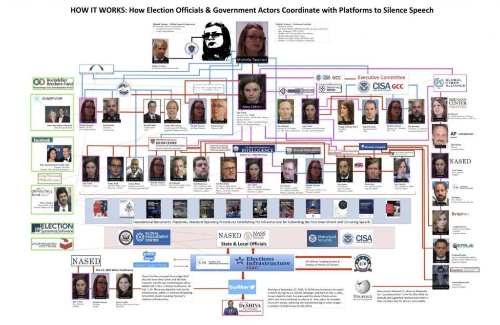 4. Les Défendeurs dans cette affaire étaient les architectes de cette infrastructure. Les Défendeurs et leurs alliés ont co-écrit les documents fondateurs – The Playbooks – au Belfer Center for Defending Digital Democracy (Centre Belfer pour la défence de la démocratie digitale) de Harvard, ont témoigné devant la Commission du renseignement du Sénat américain pour faire pression en faveur d’une telle infrastructure, et ont noué des relations avec des milliardaires, en particulier Pierre Omidyar, par le biais de son Democracy Fund (Fond pour la démocratie), ainsi qu’avec les frères Rockefeller, le Quadrivium de la famille Murdoch, Mark Zuckerberg et d’autres entités non gouvernementales, pour financer, concevoir et déployer cette infrastructure centralisée de censure de la parole. Le diagramme de réseau de la Pièce A fournit une illustration visuelle de ces relations et de l’infrastructure technologique qu’elles ont créée pour censurer la parole. Ces relations ont fourni aux Défendeurs un accès spécial à des canaux à utiliser si nécessaire et en cas de besoin pour leur bénéfice personnel, non seulement pour mettre sur liste noire et surveiller des citoyens américains, mais aussi pour réduire au silence leur discours national, ce qu’ils ont fait au Dr Shiva à partir du 25 septembre 2020.
