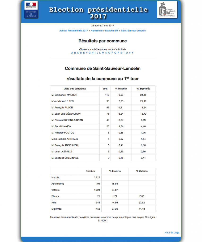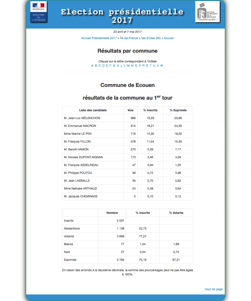 Résultats officiels du premier tour des élections 2017 (25/04 et 28/04)