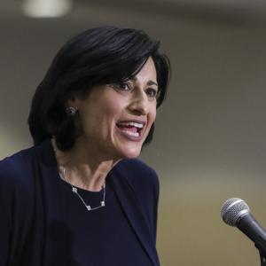 La directrice du CDC, Rochelle Walensky, s’adresse aux journalistes après avoir visité le site de vaccination de masse de la FEMA du Hynes Convention Center à Boston, Massachusetts, le 30 mars 2021.