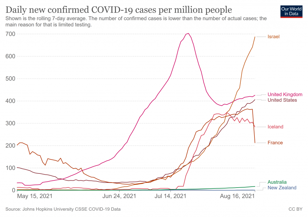 Australie, Nouvelle-Zélande deux pays covidolâtres. Les deux pays procèdent aux confinements stricts alors qu’ils ont des niveaux de contaminations et de décès parmi les plus bas au monde. C’est à se demander si le Covid n’est pas une religion où on communie à coup de restrictions et de confinements.