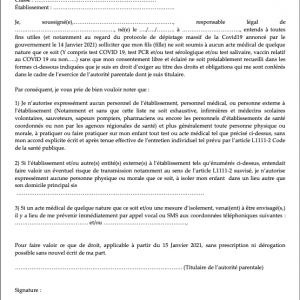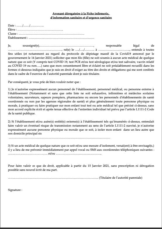 Rappelons qu’il s’agit d’un acte médical qui ne peut être réalisé sans l’accord des responsables de l’enfant mineur. Nous vous invitons à prendre connaissance de l’avis de RéinfoCovid sur la question, et de fournir pour ceux qui le souhaitent un avenant à la fiche d’infirmerie à l’école de votre enfant. Vous trouverez le document à imprimer et à remplir dans l’article.