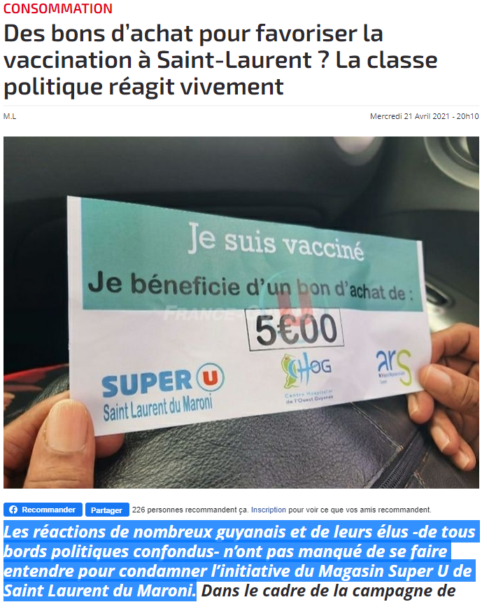 Dans le cadre de la campagne de vaccination en cours, l’enseigne Super U de Saint Laurent du Maroni en Guyane offre des bons d’achats d’une valeur de cinq euros pour les 2.000 premiers vaccinés contre la Covid-19.