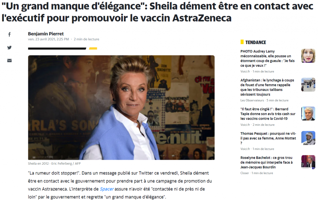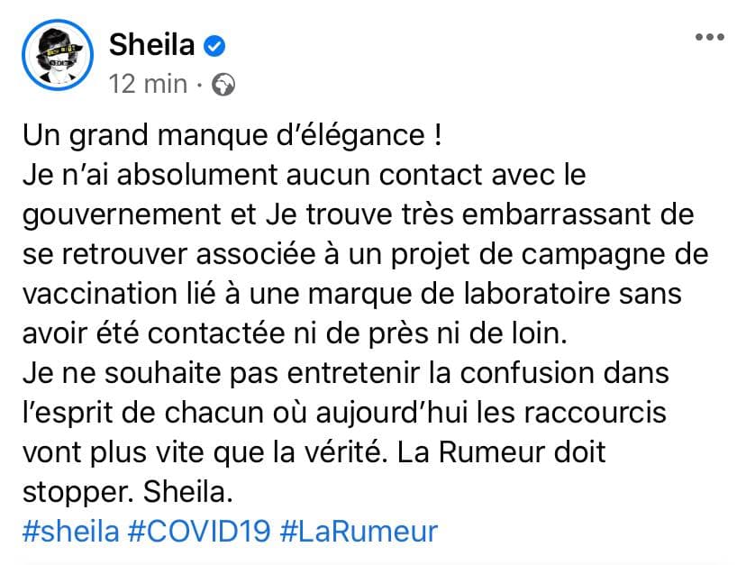La chanteuse Sheila en colère contre le gouvernement. Elle dénonce un manque d’élégance et assure ne pas avoir été contactée par le gouvernement concernant une probable campagne de promotion de la vaccination.