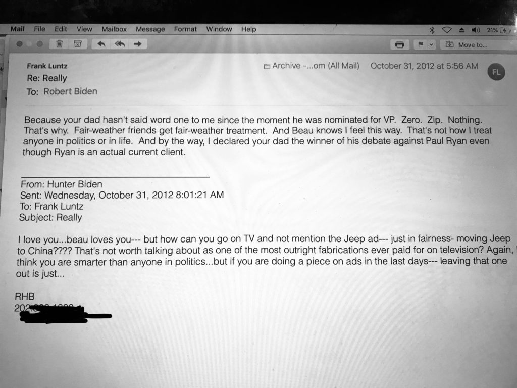 Hunter Biden : Je t’aime… beau t’aime (beau = grand frère de Hunter)… mais comment peux-tu passer à la télévision et ne pas mentionner la pub de Jeep et… juste en toute équité, le déménagement de Jeep en Chine ???? Cela ne vaut pas la peine d’en parler comme d’une des fabrications les plus consequentes jamais payés à la télévision ? Encore une fois, tu penses que tu es plus intelligent que n’importe qui en politique… mais si tu fais un article sur les publicités dans les derniers jours… laisser celui-là de côté est juste…
