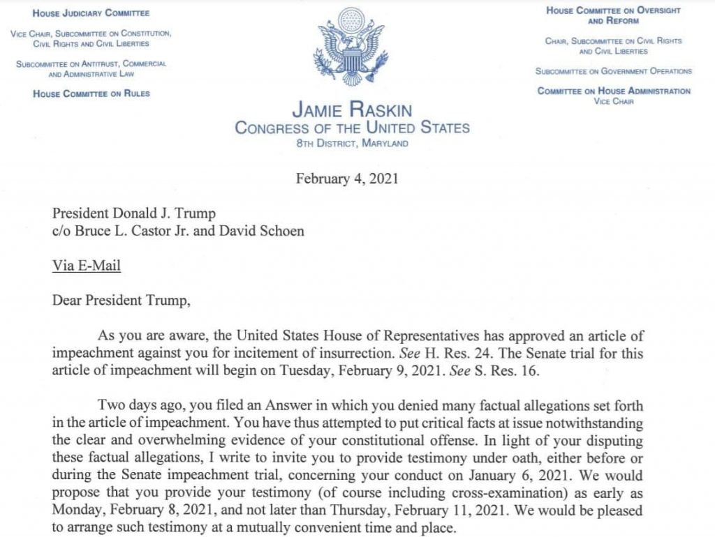 Le responsable de la mise en accusation de la Chambre des représentants a envoyé une lettre à l’ancien président Donald Trump lui demandant de fournir un « témoignage sous serment », soit avant, soit pendant le procès de mise en accusation du Sénat.