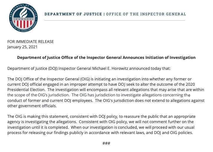 Le bureau de l’inspecteur général du DOJ (OIG) ouvre une enquête pour déterminer si un ancien ou actuel fonctionnaire du DOJ s’est engagé dans une tentative inappropriée de faire en sorte que le DOJ cherche à modifier le résultat de l’élection présidentielle de 2020. L’enquête portera sur toutes les allégations pertinentes qui pourraient survenir et qui relèvent de la compétence de l’OIG. L’OIG est compétent pour enquêter sur les allégations concernant la conduite des anciens et actuels employés du DOJ. La compétence de l’OIG ne s’étend pas aux allégations contre d’autres fonctionnaires du gouvernement.