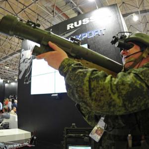 Un manifestant hisse un missile sol-air lancé à l’épaule sur le stand de Rostec lors d’un salon de la défense et de la sécurité à Rio de Janeiro, en 2013