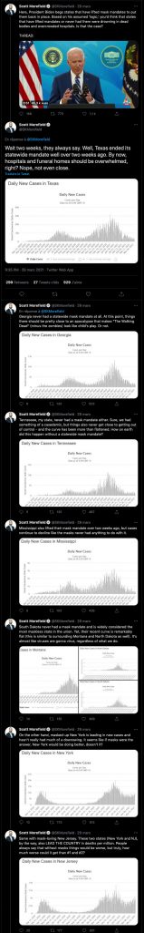 Dans ce thread, le journaliste Scott Morefield, compare l’évolution du nombre de cas entre les états américains qui ont complètement arrêté les mesures anti-COVID, notamment masque et distanciation sociale, avec les états qui maintiennent en place ces restrictions. Le résultat est édifiant.