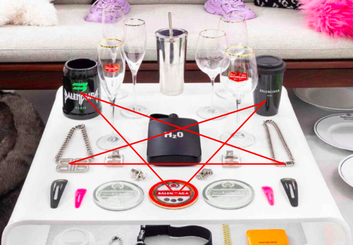 En reliant, sur ces deux clichés certains objets qui portent le nom de la marque, on arrive, assez étrangement, à cette forme de pentagramme inversé
