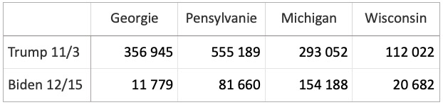 Navarro fournit une image montrant les résultats dans ces États à minuit le jour de l’élection (quand le vote devrait être terminé) et à nouveau un mois plus tard :