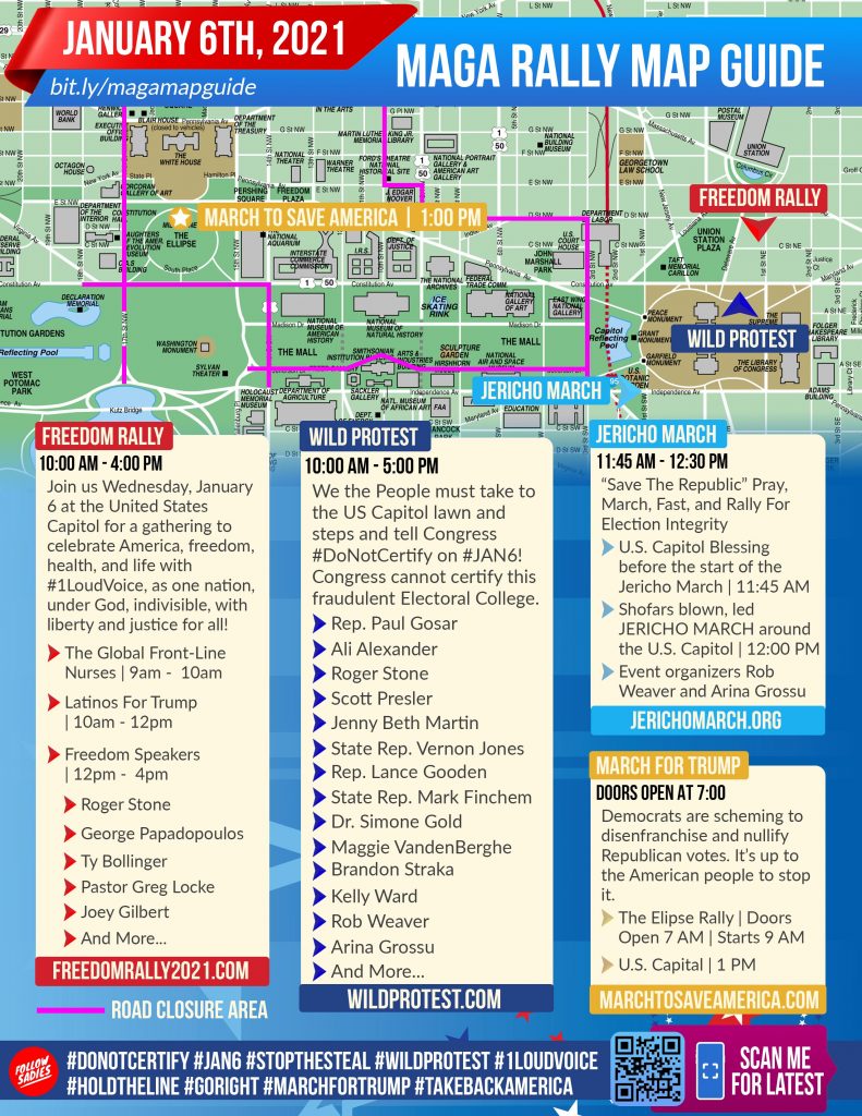 Pendant des semaines, M. Trump avait exhorté ses partisans à se rendre à Washington pour empêcher la certification des résultats des élections. Plusieurs rassemblements simultanés sont prévus, dont le « rassemblement sauvage » sur la pelouse du Capitole, comme le montre cette carte réalisée par les partisans.