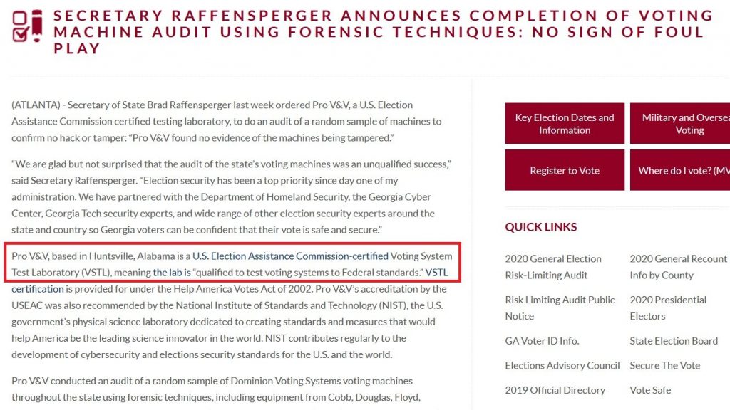 Le problème avec le mémo de M. Raffensperger est que Pro V&V n’a pas été certifié en 2020 au moment où il a effectué les audits des machines de vote Dominion en Géorgie.