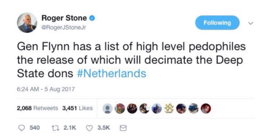 Roger Stone est un américain conservateur, conseiller politique, lobbyiste et ancien hôte d’Infowars. En novembre 2019, à la suite du rapport Mueller et de l’enquête du conseil spécial, il a été condamné pour sept chefs d’accusations, y compris l’altération de témoignages. Le 20 février 2020, il a été condamné à 40 mois de prison fédérale. La peine a été commuée (réduite considérablement) par le président Donald Trump le 10 juillet 2020. (Source)