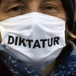 Une femme portant un masque de protection sur lequel on peut lire  »dictature » proteste contre les restrictions gouvernementales, bien que le rassemblement ait été interdit par un tribunal régional, dans le cadre de l’épidémie de COVID-19, à Brême, en Allemagne, le 5 décembre 2020.