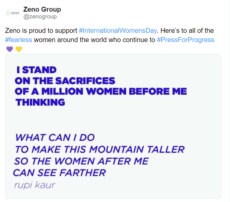 7 – Dans une déclaration publiée le 20 mars 2021 sur le site Web de l’entreprise, @zenogroup a déclaré que tout le monde doit s’engager « en faveur d’un monde égalitaire entre les sexes » et que cela inclut « la prise de parole face à l’inégalité ».